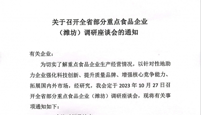关于召开全省部分重点食品企业(潍坊) 调研座谈会的通知有关企业:为切实了解重点食品企业生产经营情况,以针对性地助力企业强化科技创新、提升质量品牌、增强核心竞争能力、拓展国内外市场,经研究,我会定于 2023年