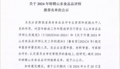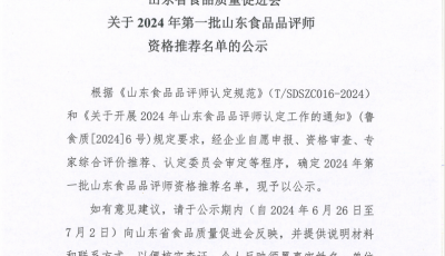 根据《山东食品品评师认定规范》(T/SDSZC016-2024)和《关于开展2024年山东食品品评师认定工作的通知》(鲁食质[2024]6号)规定要求,经企业自愿申报、资格审查、专家综合评价推荐、认定委员会审定等程序,确定2024年