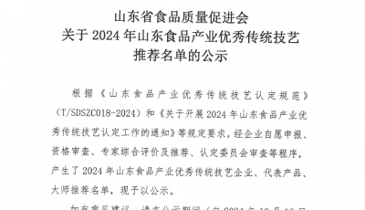 根据《山东食品产业优秀传统技艺认定规范》(T/SDSZC018-2024)和《关于开展2024年山东食品产业优秀传统技艺认定工作的通知》等规定要求,经企业自愿申报、资格审查、专家综合评价及推荐、认定委员会审查等程序,产
