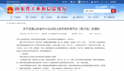 关于征集山东省中小企业网上拓市场共享平台(第三批)的通知各市工业和信息化局,青岛市民营经济发展局,滨州市民营经济发展服务中心,有关平台:根据《关于印发2022年“稳中求进”高质量发展政策清单(第一批)的通