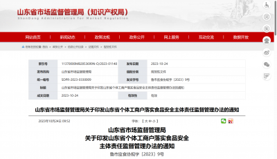 山东省市场监督管理局关于印发山东省个体工商户落实食品安全主体责任监督管理办法的通知鲁市监食协规字〔2023〕9号各市市场监督管理局:《山东省个体工商户落实食品安全主体责任监督管理办法》已经省局局务会审议通