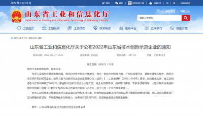 山东省工业和信息化厅关于公布2022年山东省技术创新示范企业的通知鲁工信技〔2022〕113号各市工业和信息化局,有关企业:为深入实施创新驱动发展战略,强化企业技术创新主体地位,树立一批技术创新能力强、产业化成