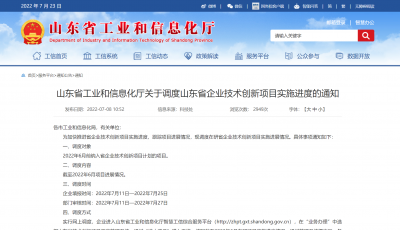山东省工业和信息化厅关于调度山东省企业技术创新项目实施进度的通知各市工业和信息化局,有关单位:为加快推进省企业技术创新项目实施进度,跟踪项目进展情况,现调度在研省企业技术创新项目实施进展情况。具体事项